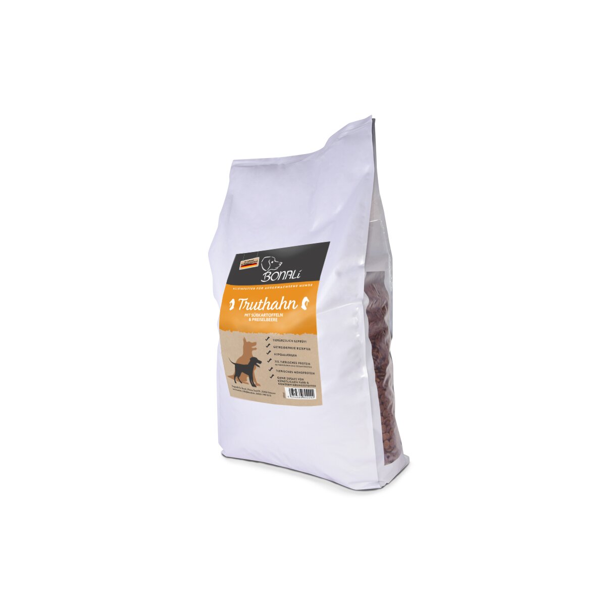 Truthahn 50% (enthält frisch zubereiteten Truthahn 28%, getrockneter Truthahn 20% und Truthahnbrühe 2%), Süßkartoffel (26%), Erbsen (9%), Kartoffel, Rübenschnitzel (entzuckert), Leinsamen, Fischöl, Mineralien, Gemüsebrühe, Preiselbeere (0,3%), Fructooligosaccharide (FOS, 96 mg/kg), Mannanoligosaccharide (MOS, 24 mg/kg)